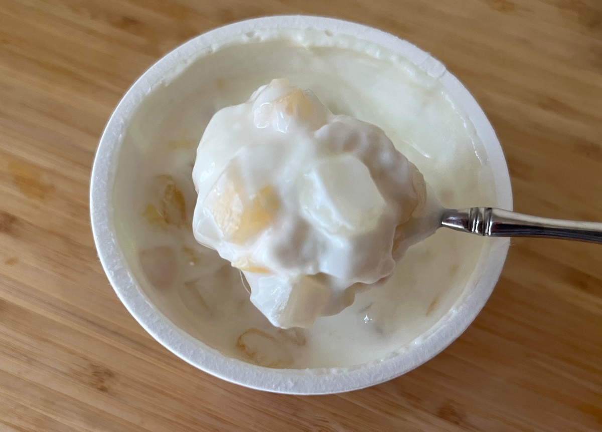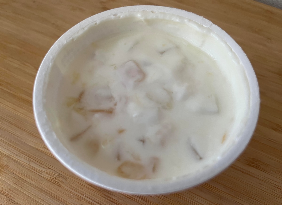 パインと黄桃は甘くてジューシー!ナタデココは独特の食感でアクセントになります。全体的に甘めでおいしい!具だくさんなので、デザート感覚でも食べられます。ボリューミーなので、朝食にもぴったり!