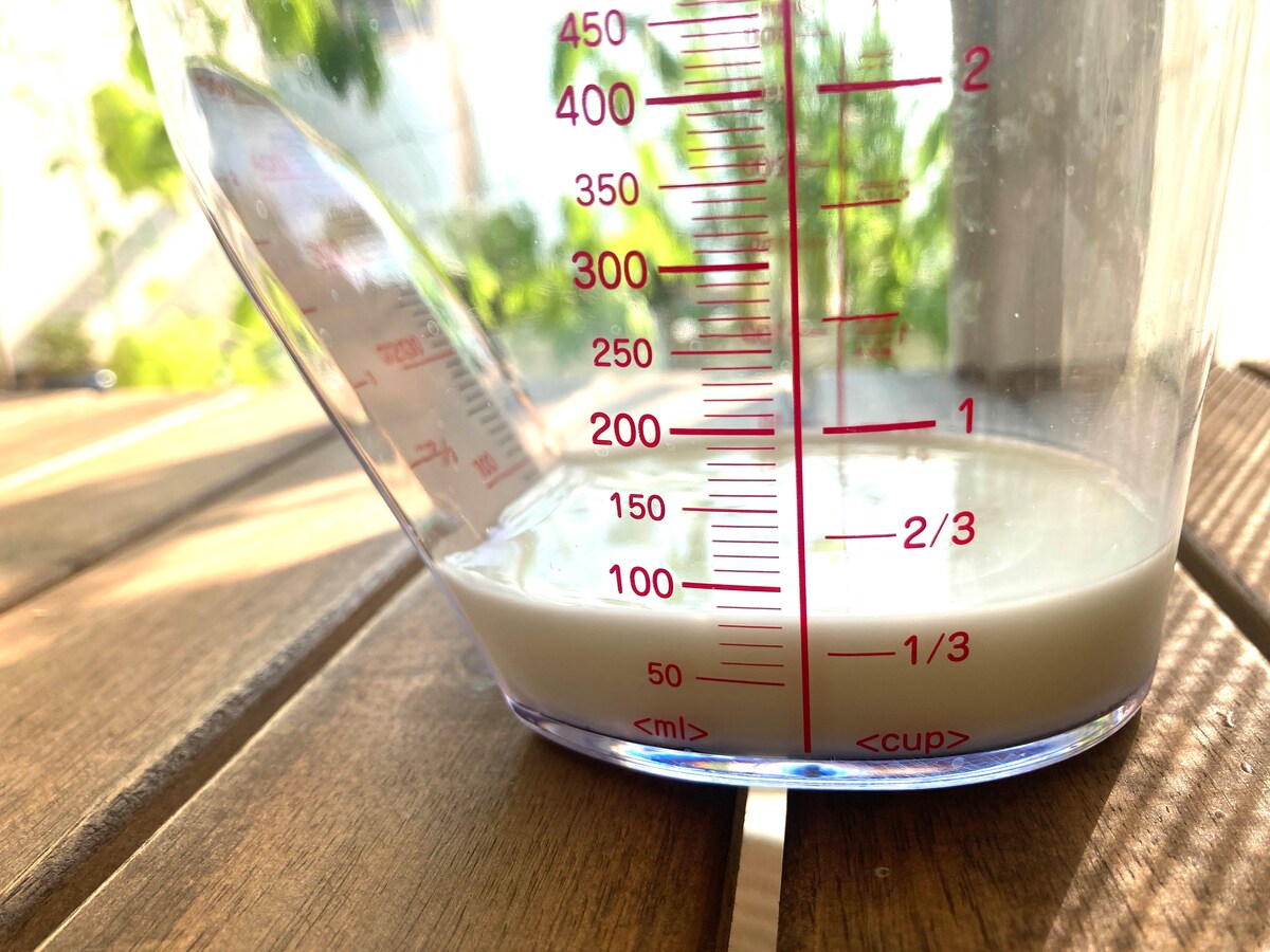 柔らかくなったら、冷たい牛乳を70cc用意。