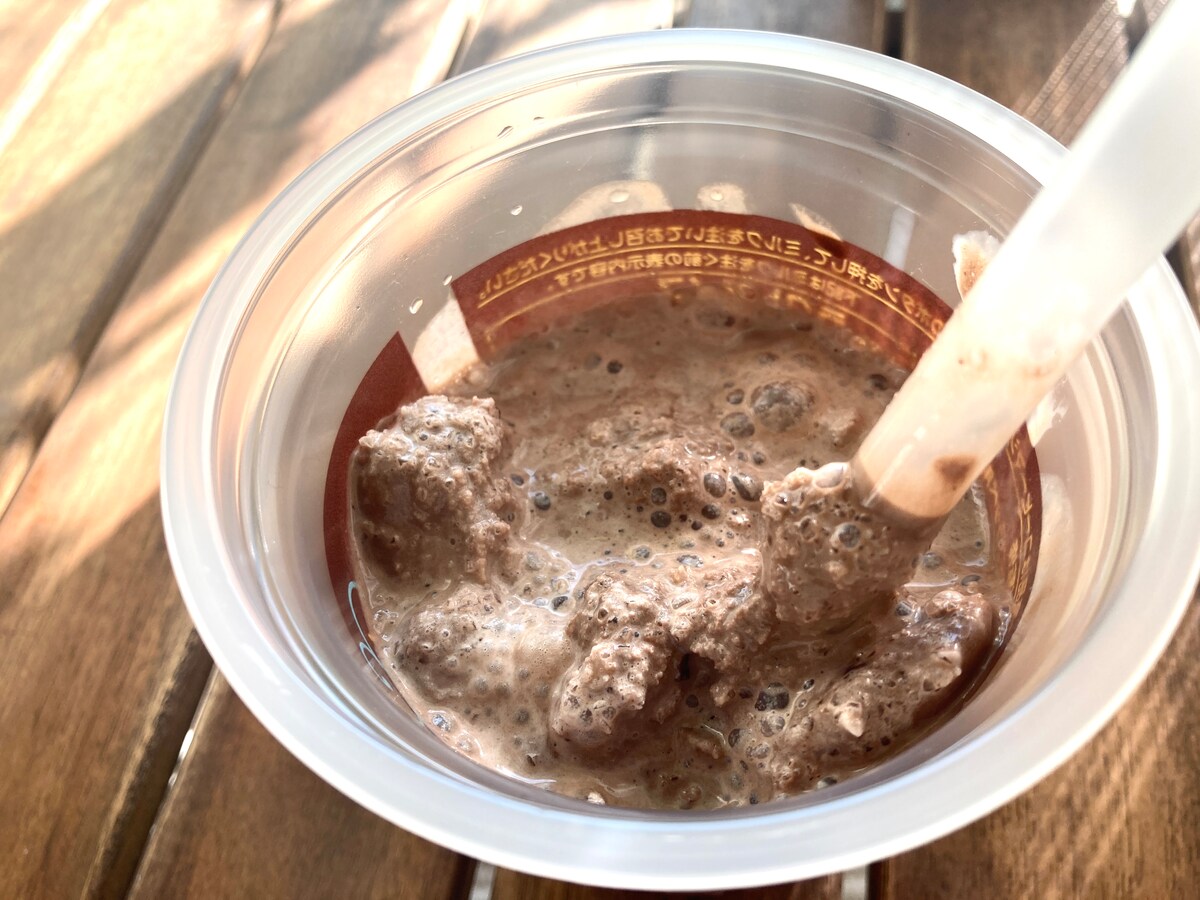 暑さでややフラッペが溶けてきてもチョコチップの食感は健在なので、最初は氷の粒と一緒に、最後はチョコスムージー的な質感の中でのアクセントに、とその本格的な味わいだけでなく食感でも楽しめます。まさに一切の隙無し。