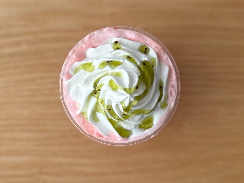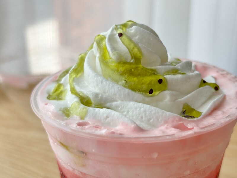 見た目もネーミングも真夏にぴったりそうな「すいかフラッペ」。フタを開けると、キウイ&ばななソースがかかったホイップクリームが、存在感を発揮しています。