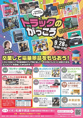 札幌地区トラック協会は、9月28日(日)にイオンモール札幌平岡にて「トラックのがっこう」を開催する。トラックや物流を体験できるファミリーイベントで、「学校」をテーマにしたさまざまな“授業”に参加できる。