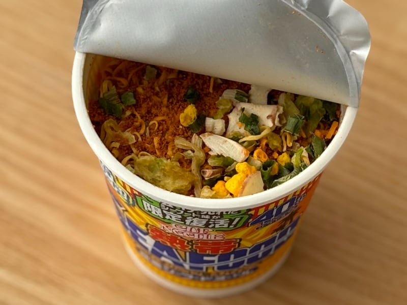 さっそくフタを開けてみると、中には具材のかやくがたっぷり!既に食べ応えがありそうです。