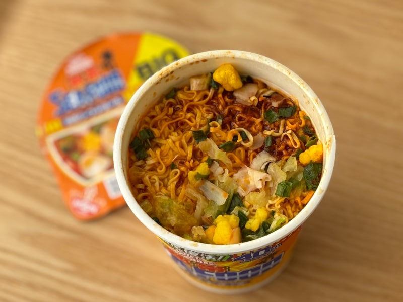 魚介の旨みがきいたシーフードスープに、まろやかなココナッツミルクとチリの辛味、エビの旨みを加えたというカップヌードル。お腹がペコペコのときにもうれしいビッグサイズで、イカ、キャベツ、たまご、ネギの具材がたっぷりと入っています。