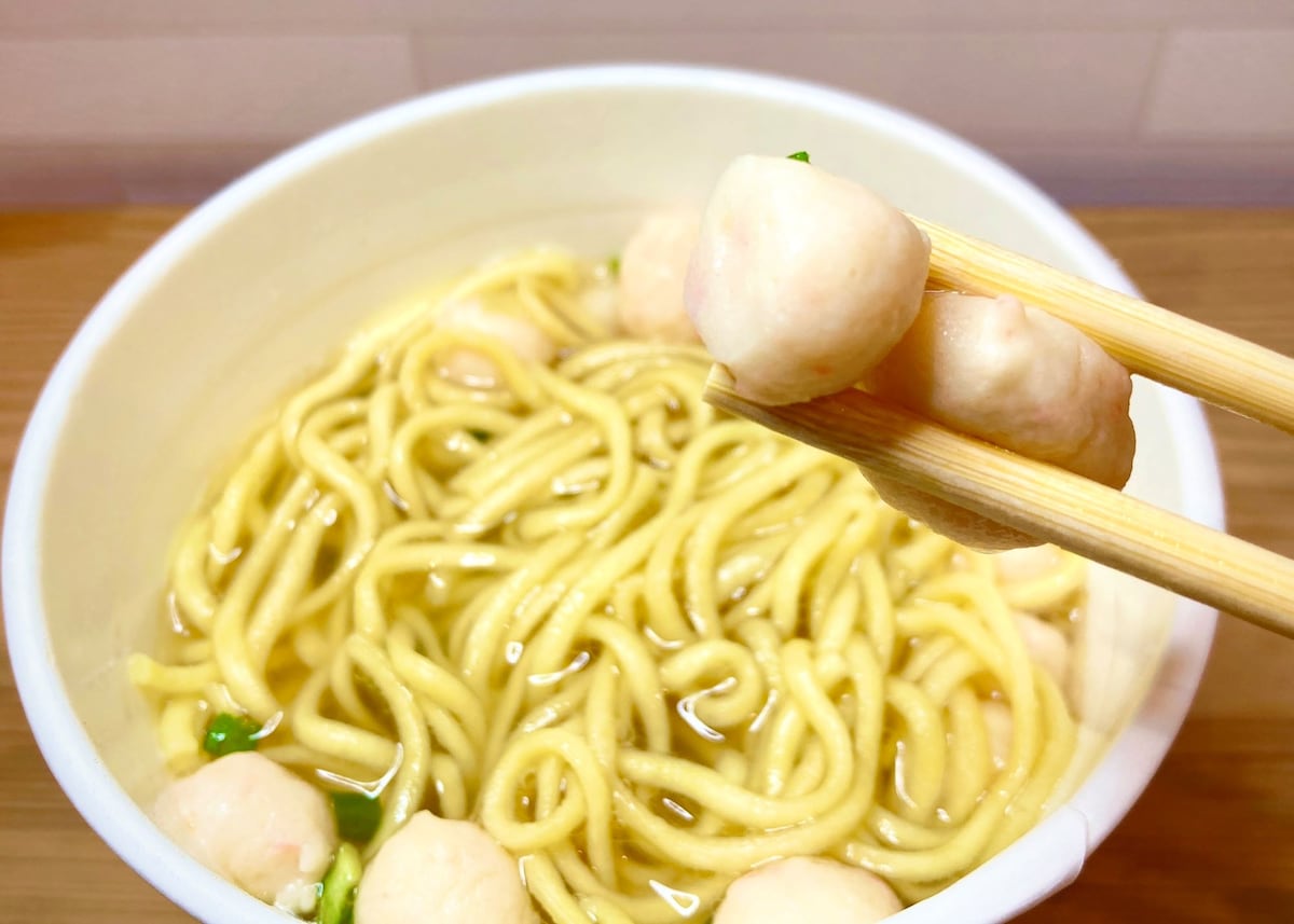 中太の麺はもっちもちのぷりぷりです。麵自体にも味が付いていますが主張し過ぎずスープと相性抜群。えび入り団子もプリっとしていて美味しいです!