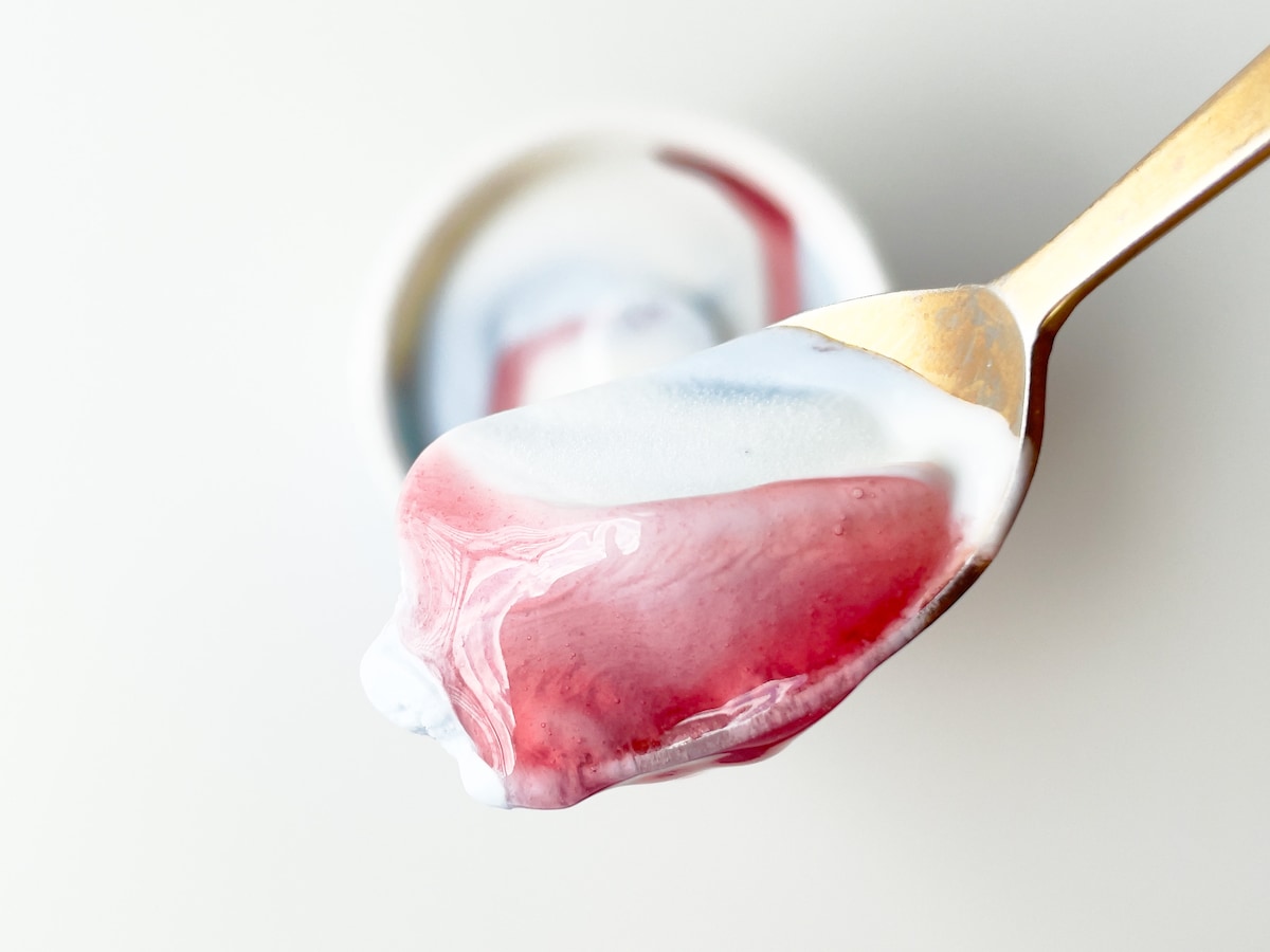 つぎに、それぞれのフレーバーごとに食べてみました。青い白ぶどう味アイスは、しっかり「白ぶどう」を主張しています。酸味は抑えられ、甘みが強い白ぶどう味でした。白いヨーグルト味アイスはやや酸味があり、甘さが強め。爽やかさと甘さが程よいバランスのヨーグルト味で、3つのフレーバーのなかではもっともマイルドです。そして赤い赤ぶどうソースは、濃厚なぶどう味。酸味が強めで果実感もあり、とてもよいアクセントになっています。