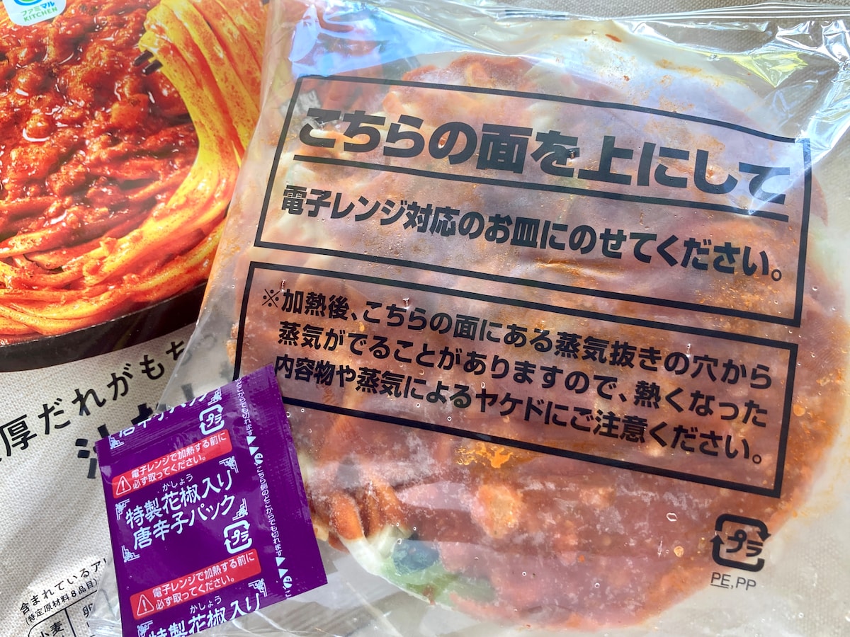 開けてみると麺とタレが一緒に冷凍された袋と、唐辛子のパックが入っていました。トレーに乗っているわけではないので注意が必要です。器に移し、このまま500wで7分加熱していきます。