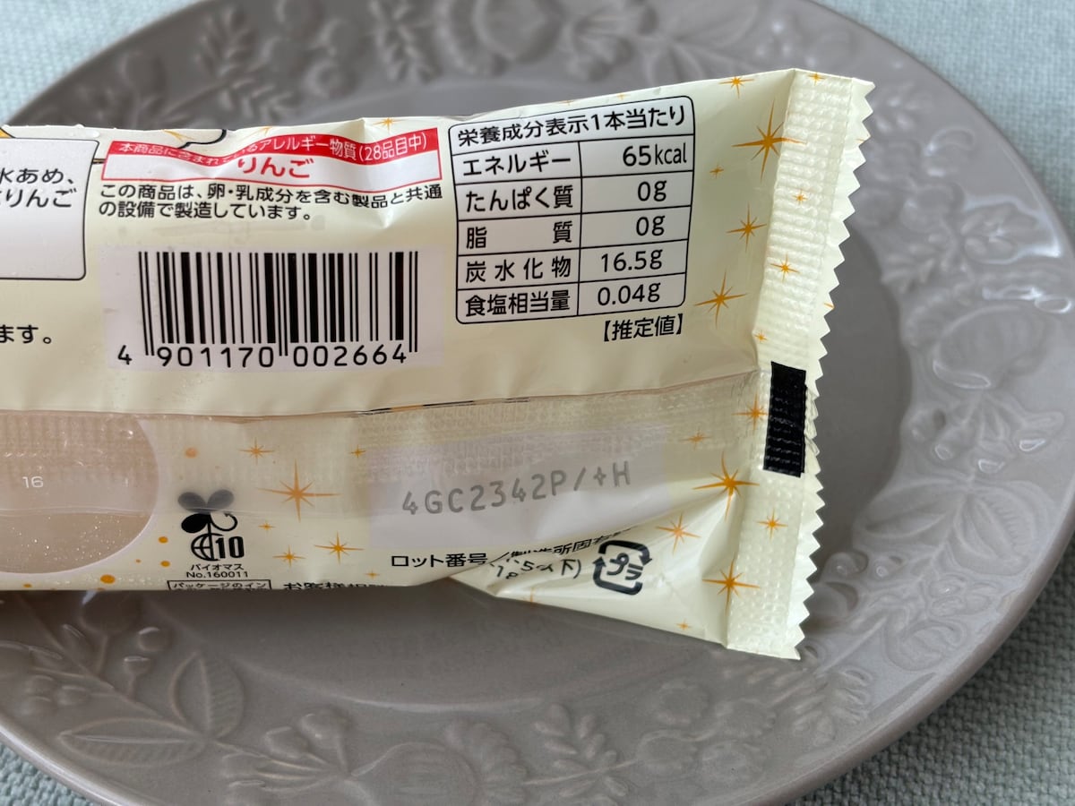 1本あたりの熱量は65kcal、たんぱく質:0g、脂質:0g、炭水化物:16.5g、食塩相当量:0.04gです。