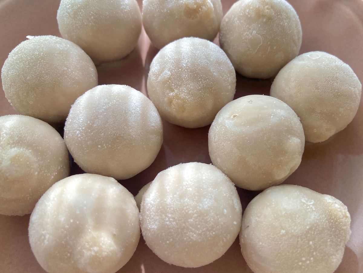 袋から出してみるとやや茶色がかった丸いアイスの実がごろっと。一つ一つがしっかり凍っているので、くっついたりせず食べやすいです。