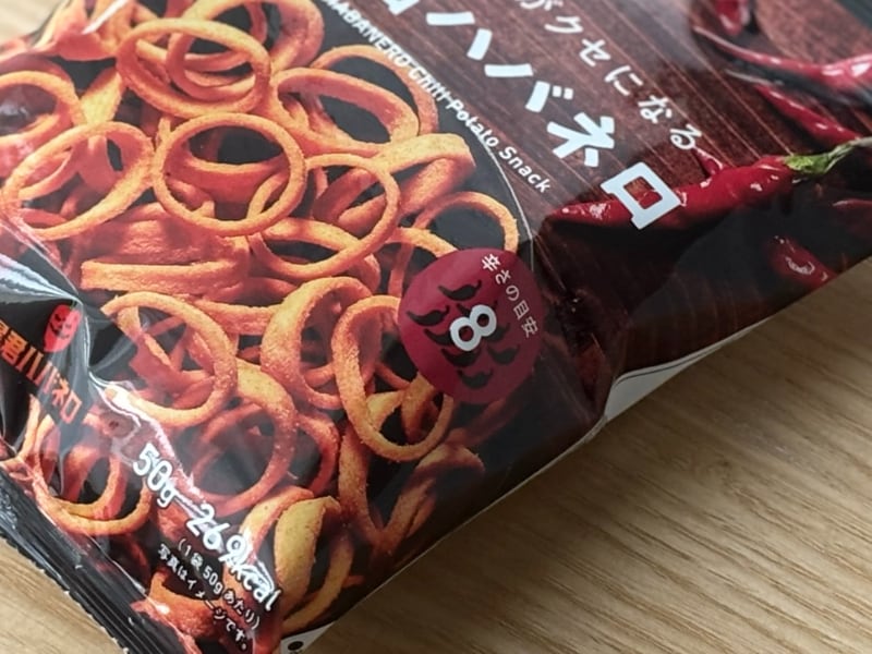 辛さの目安「8」と書かれたパッケージ。辛い物好きの筆者ですが、おなじみの「暴君ハバネロ」の前についた『超』の文字と辛さ目安に、少しドキドキしながら袋を開けます。