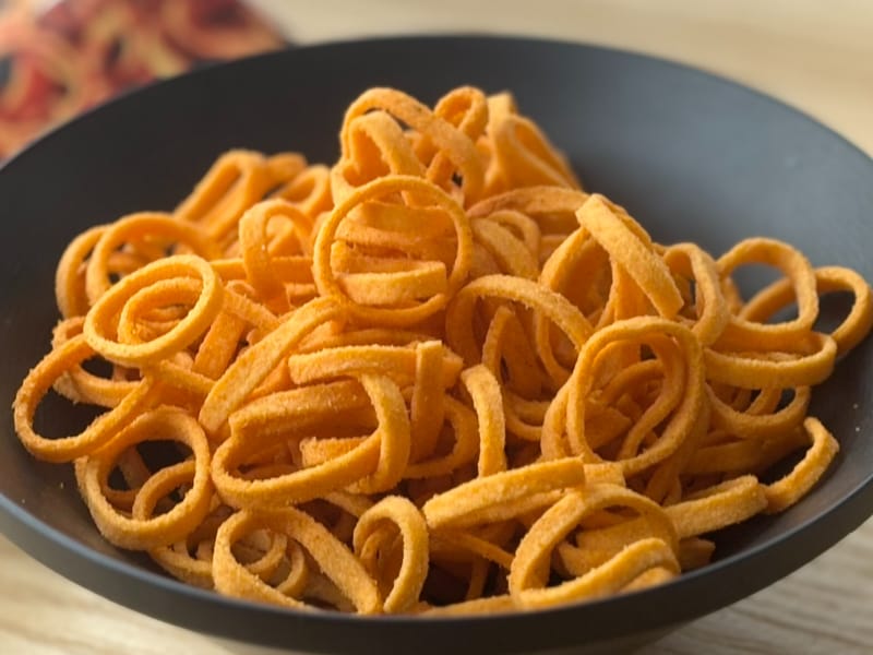 少し深めのお皿にザザザーっと出してみました。ややオレンジがかったスナックには、辛そうなパウダーがたっぷりと振りかけられています。