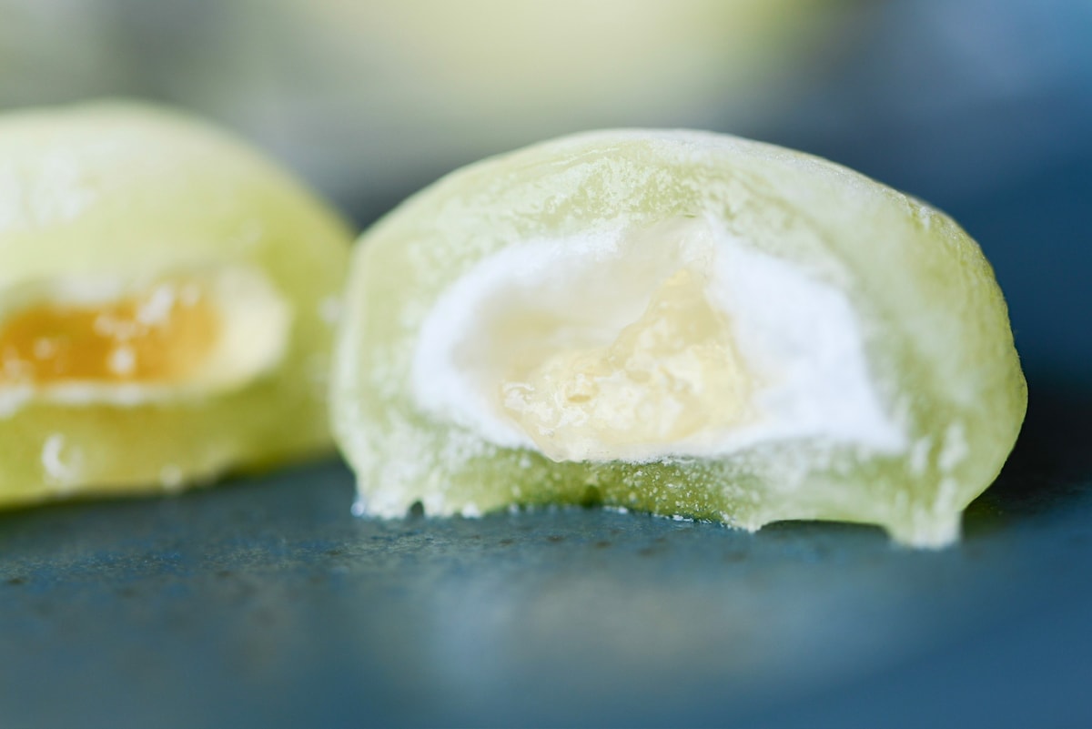 それでは実食。かじってみると、一番外側の餅がびよーんとのびました。餅はやさしい甘さで、その下にあるマシュマロはさらに甘さが強いです。中心に入っているはちみつレモンペーストは、爽やかな酸味とはちみつの甘さが程よいバランスです。餅、マシュマロ、はちみつのそれぞれの甘さが、はちみつレモンペーストの酸味をやさしく包み込みます。