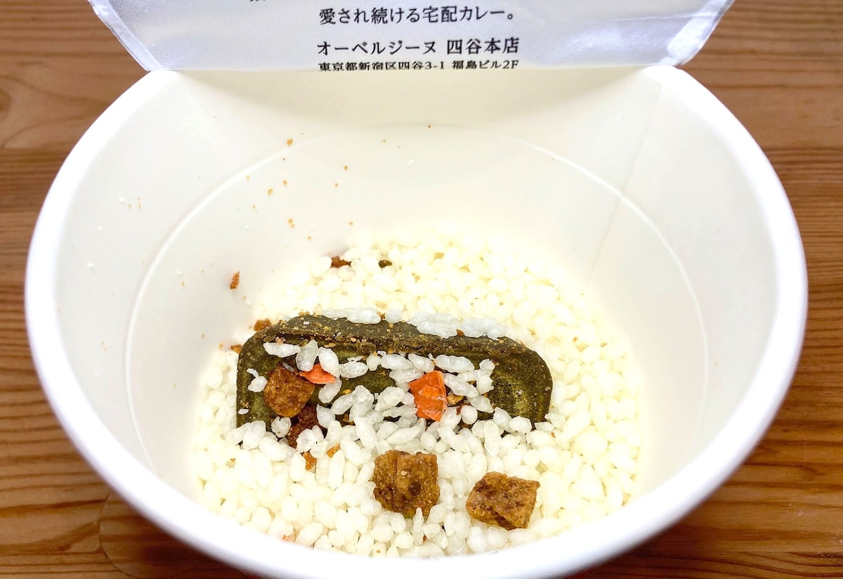 蓋を開けてみるとお米と具材、そして大きなカレールーがドスッと存在感を放っていました。