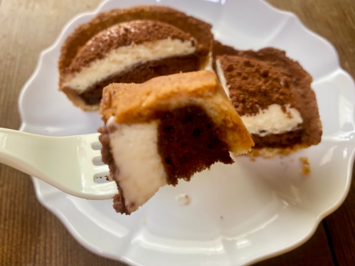 手のひらサイズですが、マスカルポーネクリームとティラミス生地とタルト生地でずっしり感があります。食べ応えありそう……。