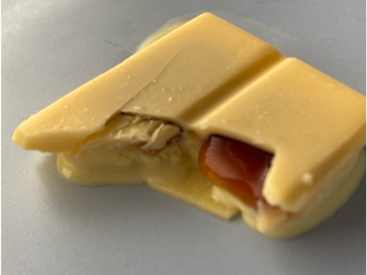 断面を見ると、プリンチョコのコーティングの中に、カラメルソースとカスタードアイスが入っています。