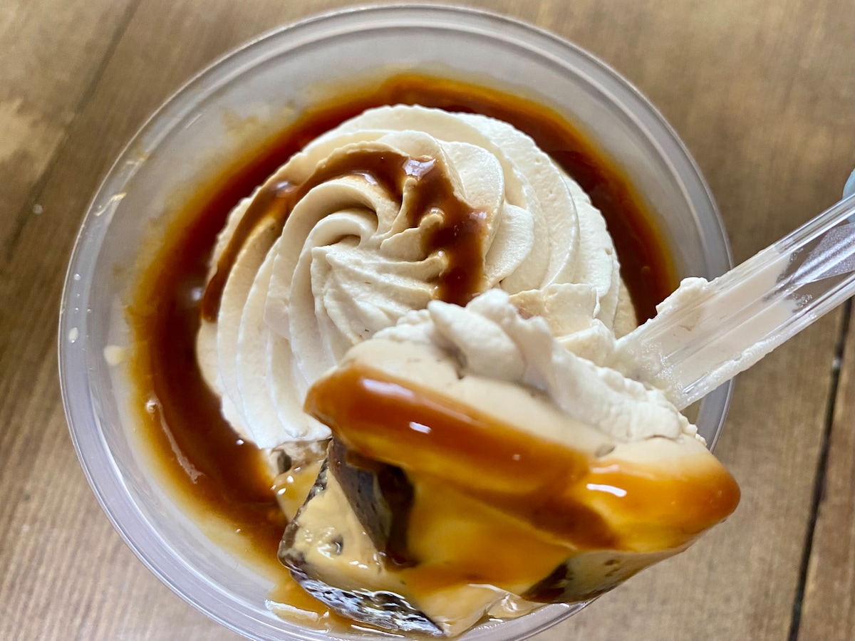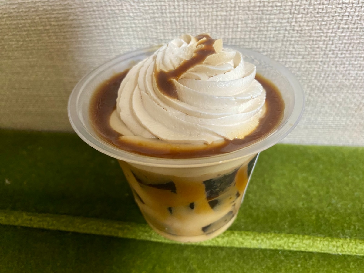 ホイップクリームにキャラメルソース、そして下にはコーヒーゼリーと牛乳プリンが入っていて、断面だけで美味しそう…!
