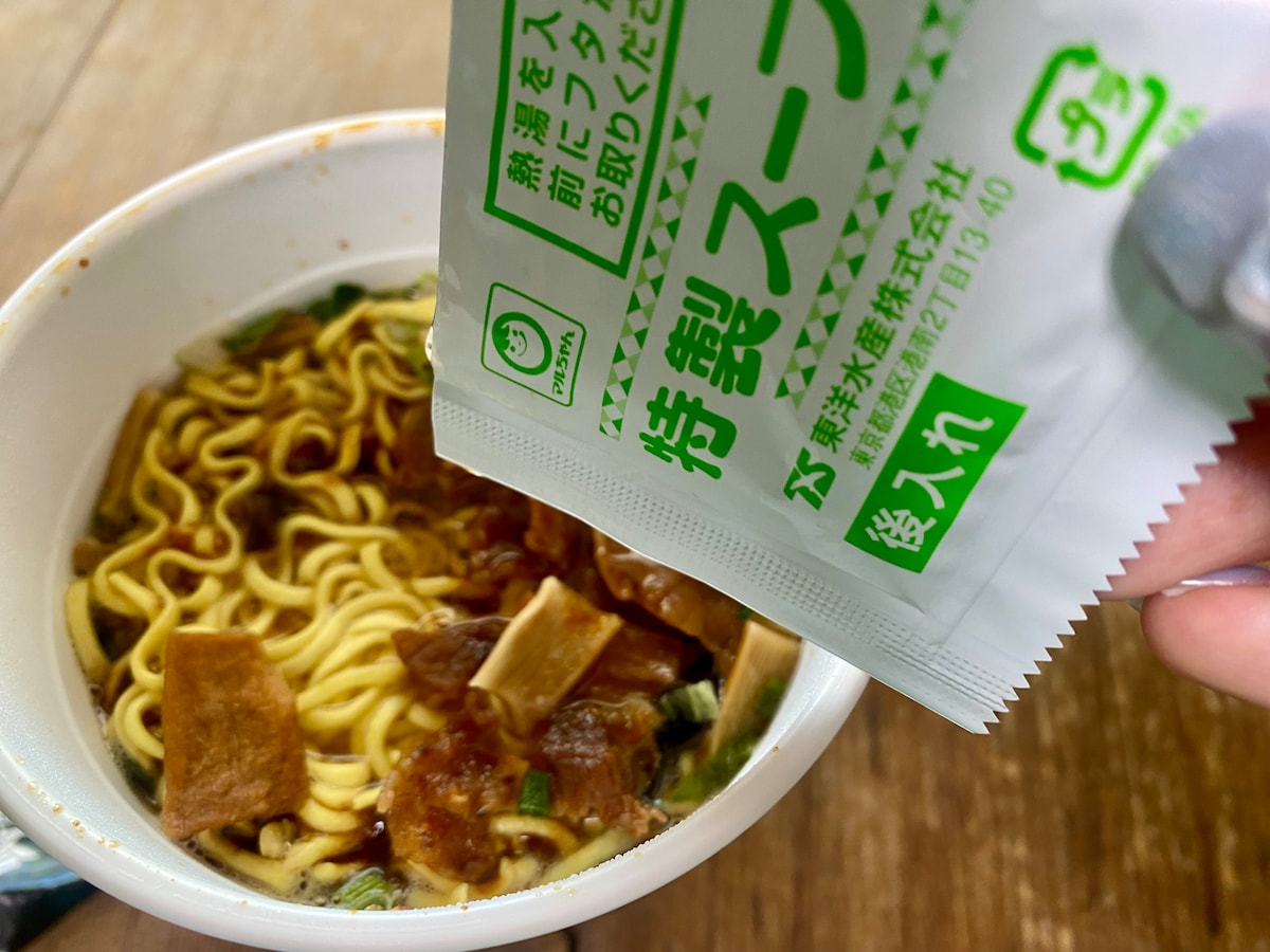 商品を無事ゲットできた筆者は、フタの上に注目。後入れの調味油がありました。