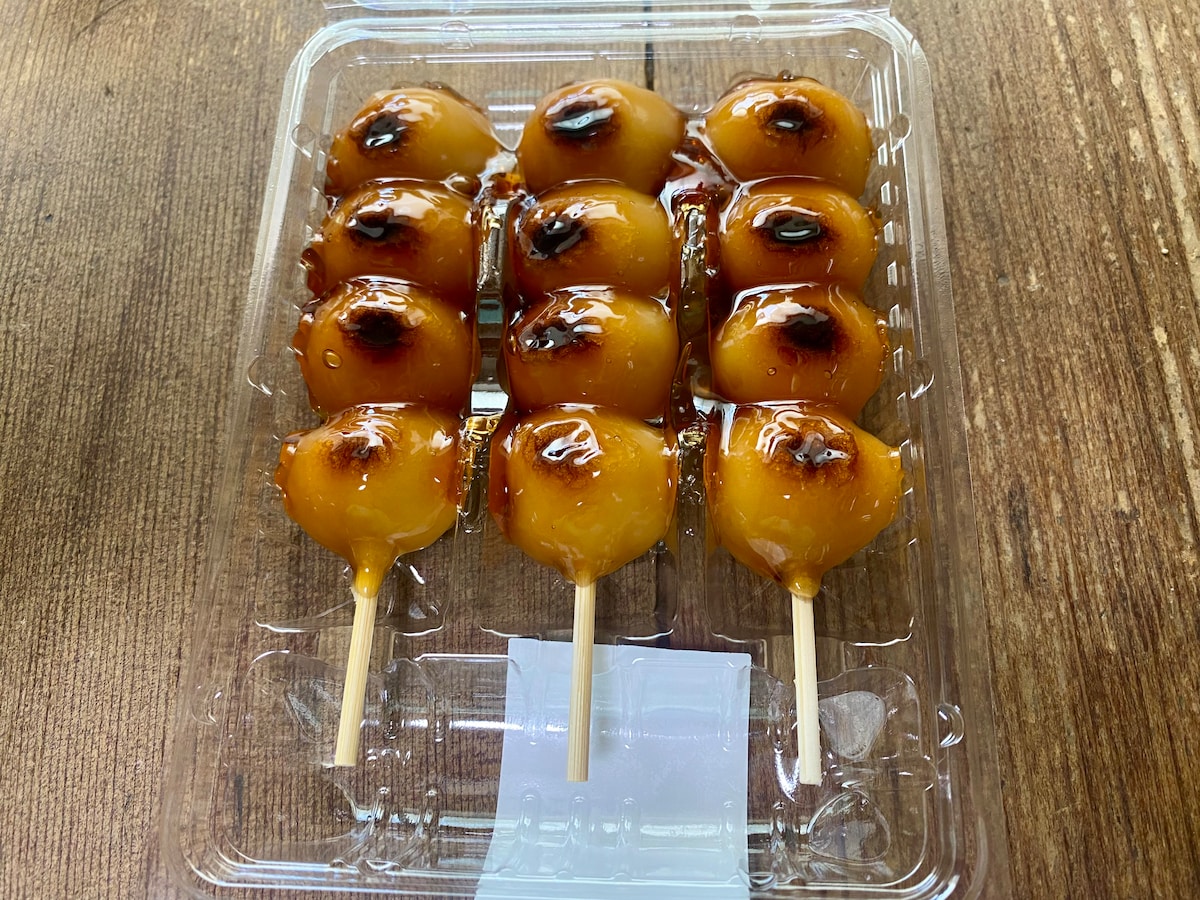 見た目はよくある3本入りの串団子ですが、やはり醤油のみたらしが輝いていて美味しそう!パックから開封した写真がこちら。