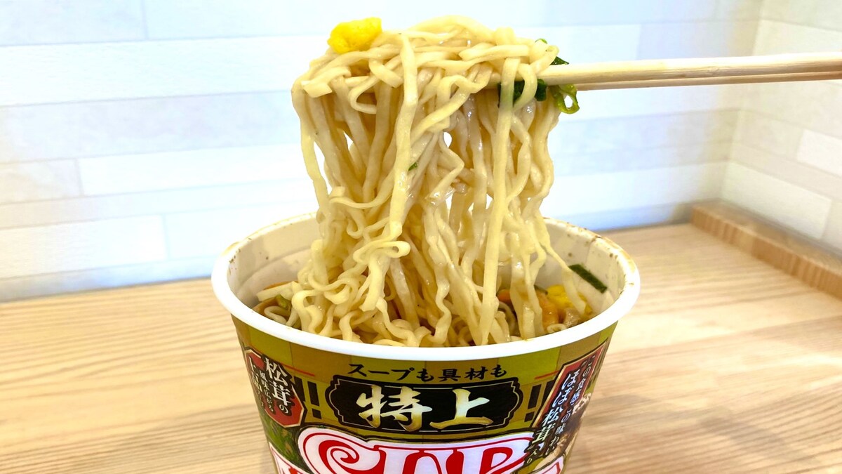 実は筆者、いつもはカレーヌードルやシーフードヌードルを選びがちで、通常のカップヌードルはほぼ食べたことがありませんでしたが……しょうゆベースのスープがあっさりしていて美味しい!松茸はと言うと、麺をすする度に癒しの香りがプンプンします。