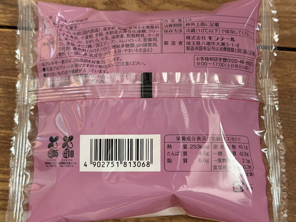 1個あたりカロリー:253kcal、たんぱく質:4.5g、脂質6.6g、炭水化物45.1g(糖質42.8g、食物繊維2.3g)、食塩相当量0.30g