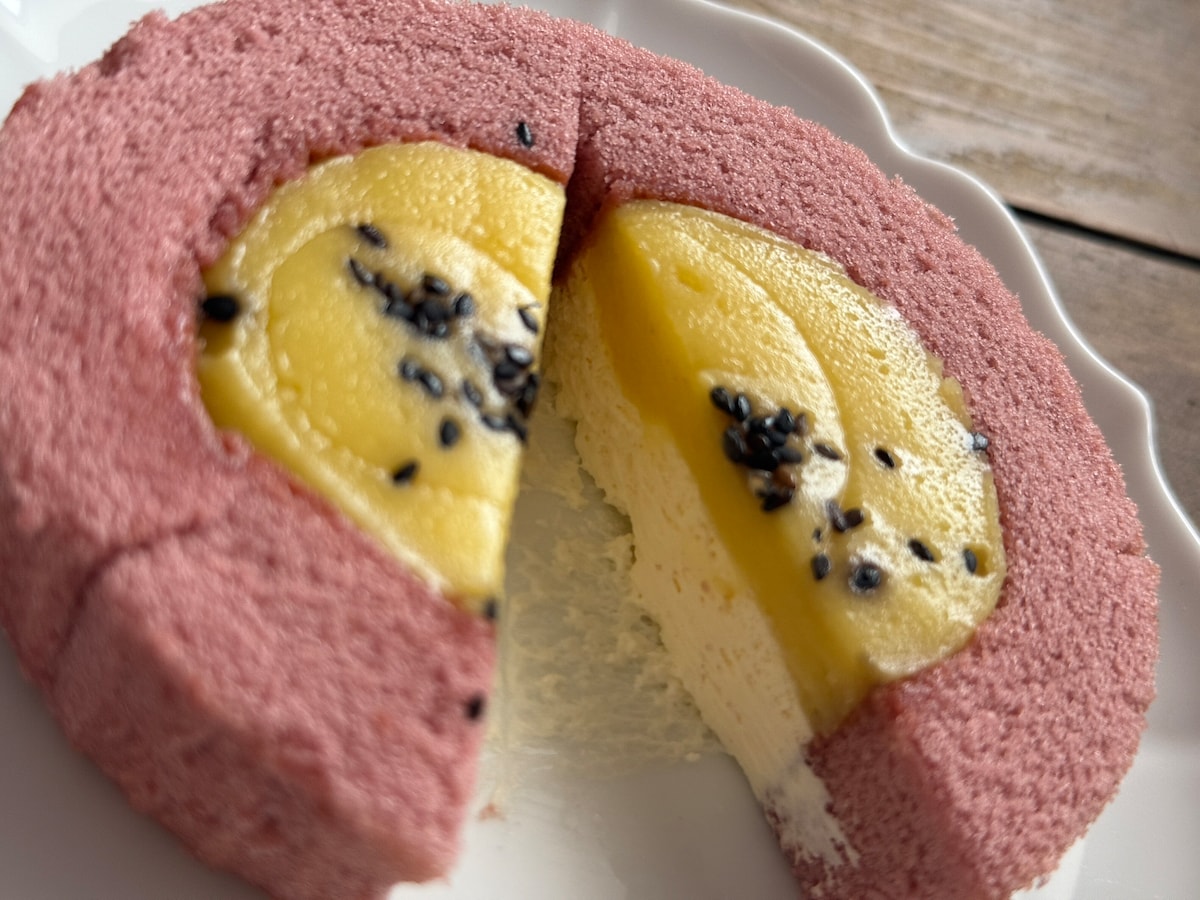 濃い黄色の安納芋クリームに、紫芋風の生地が写真映えします♡