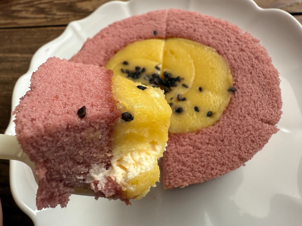 スイートポテト風味の芋クリームとカスタードクリーム、紫芋風の生地で仕上げたロールケーキです。