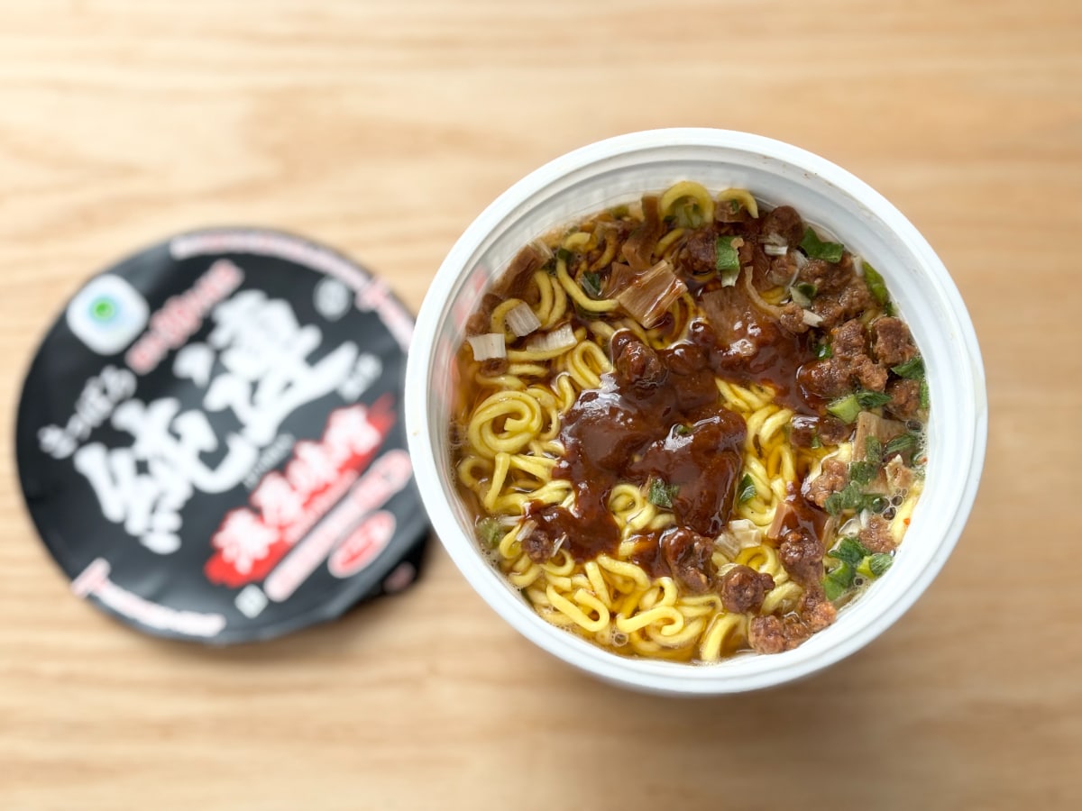 今回のカップ麺の主役ともいえるスープは、油がいい感じに浮いた見た目です。実際に口にしてみると、コクのある濃厚な味噌味の中に、香味野菜の風味と、ややピリッとした辛みを楽しめます。