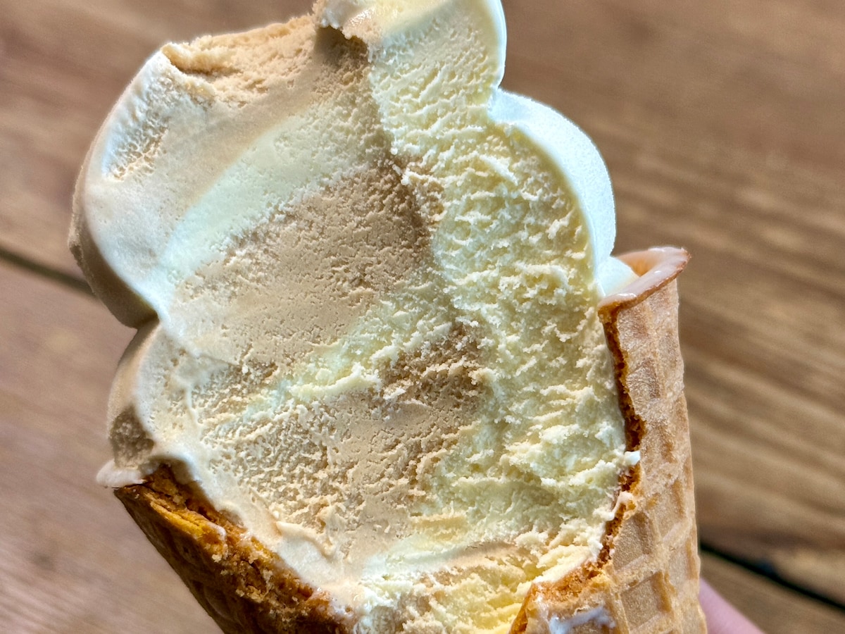 東京ばな奈の味が忠実に再現されたアイスに、全粒粉を使った香ばしいワッフルコーンがたまりません♡