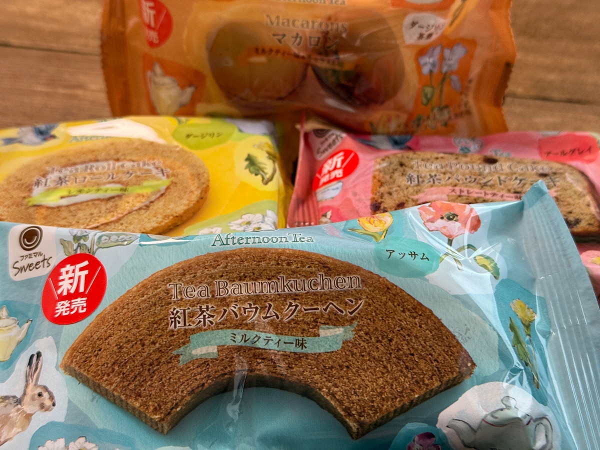 「紅茶バウムクーヘン ミルクティー味」「紅茶パウンドケーキ ストレートティー味」「紅茶ロールケーキ レモンティー味」「マカロン ミルクティー味&キャラメル味」の4種類が展開されています。すべて焼き菓子コーナーに陳列されていました。