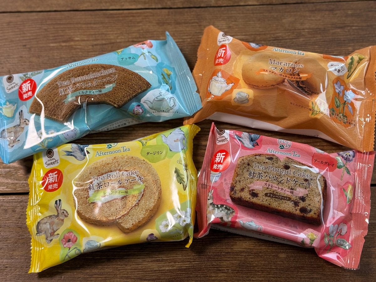 「紅茶バウムクーヘン ミルクティー味」「紅茶パウンドケーキ ストレートティー味」「紅茶ロールケーキ レモンティー味」「マカロン ミルクティー味&キャラメル味」の4種類が展開されています。すべて焼き菓子コーナーに陳列されていました。