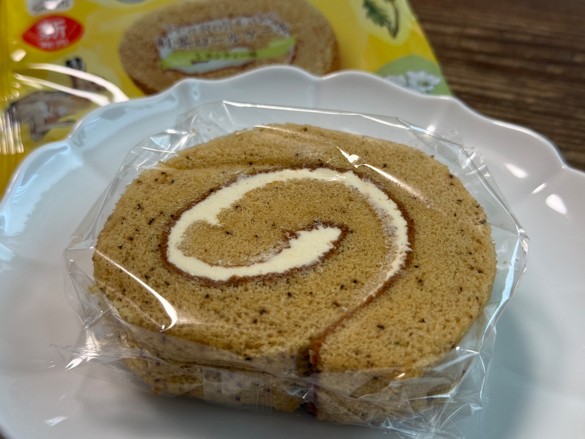 一見、茶葉が生地に練り込んである、普通のロールケーキ。透明の袋に入っていたので、外しました。