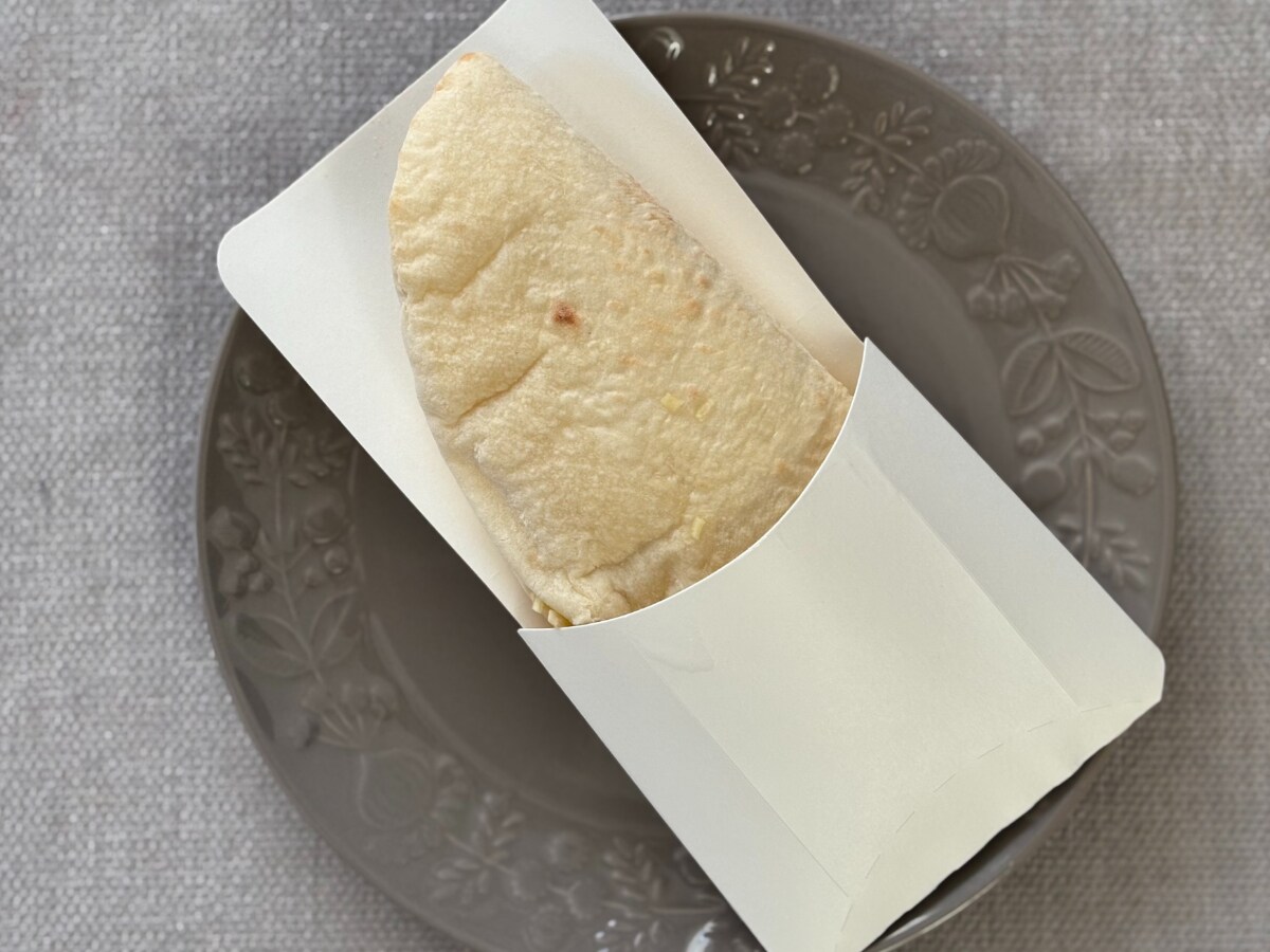 温めたものを取り出しました。中身は紙製のケースに入った仕様。出先でも手を汚さずワンハンドで食べやすいのがピザサンドの魅力の一つです。