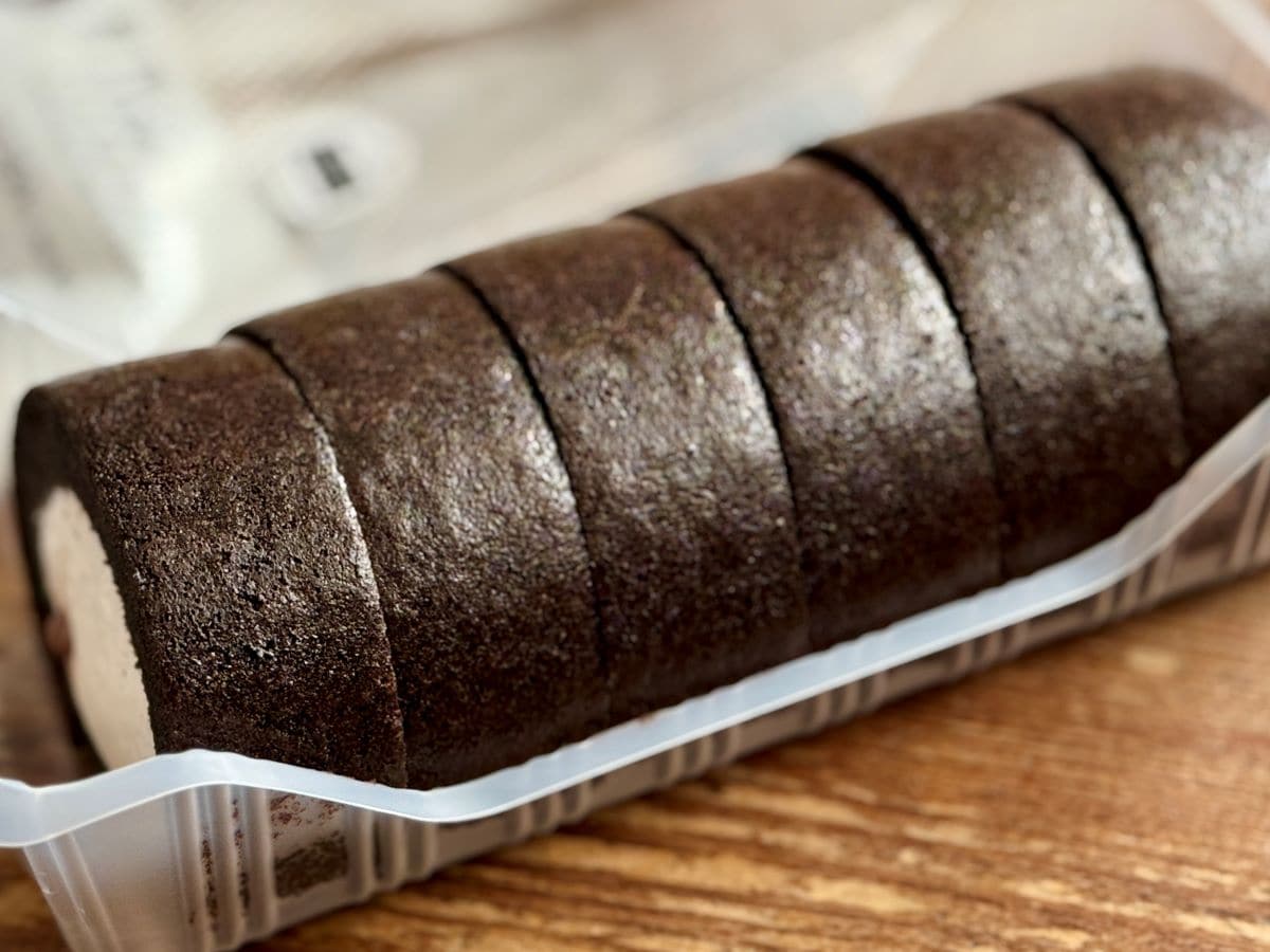 もち食感生地はいつもよりふんわりしています。ブラックココアのほろ苦さも感じつつ、生地はいつものもち食感ロールよりふわふわが勝っています。