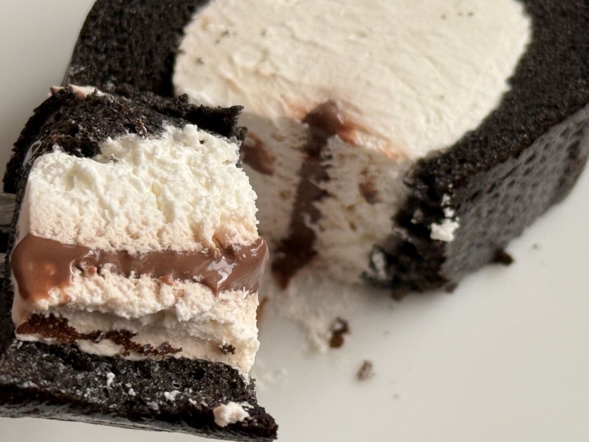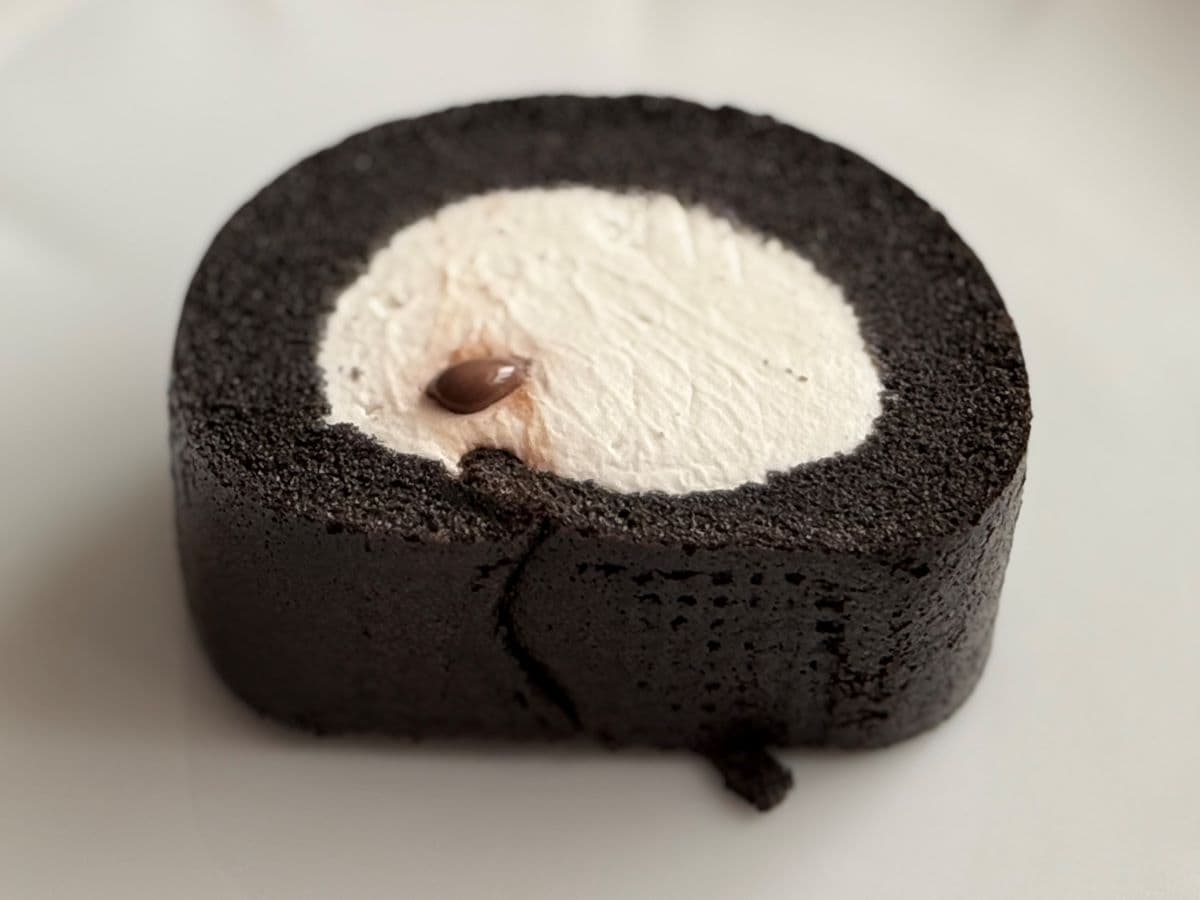 見た目は完全に海苔巻きです……(笑)生地にはブラックココアと竹炭パウダーが練り込まれています。また、中には白いホイップクリームにチョコソースが入っている様子。