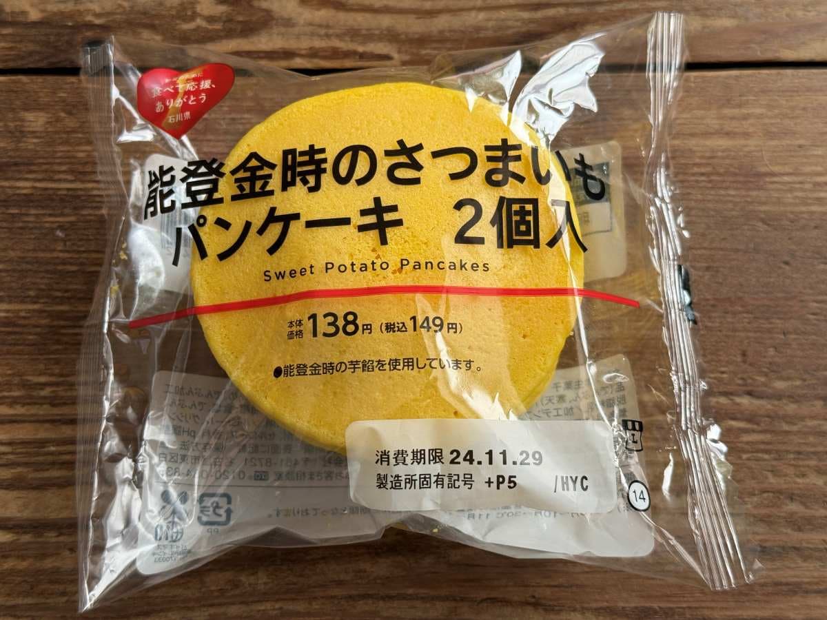 石川県能登地方を食べて応援しようという試みで、能登の名産さつまいも「能登金時」をふんだんに使ったパンケーキ。価格は税込149円で、ベーカリーコーナーに陳列されています。スイーツコーナーではないので、探す際は要注意です。