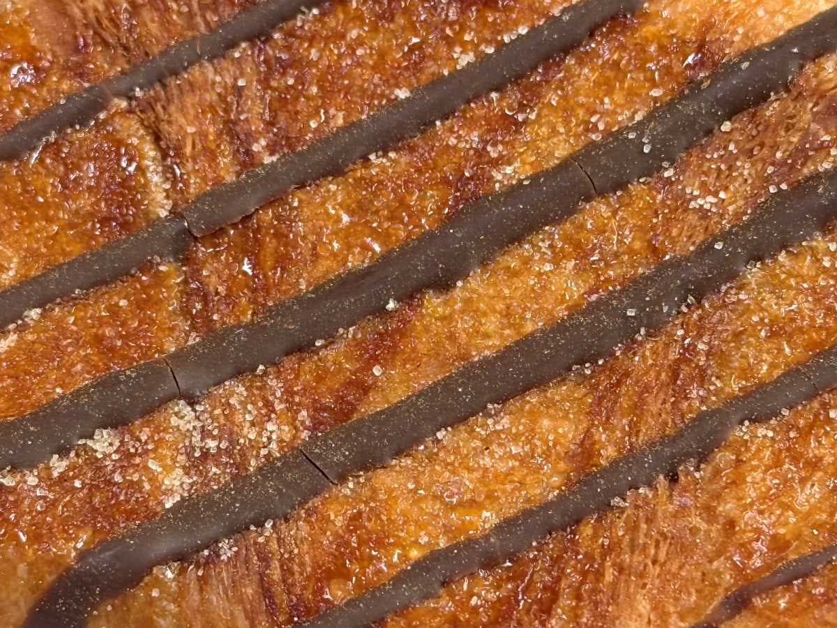 クロワッサン生地はサクサクしています。噛んでいるとジュワっとバターの旨味や風味が広がります、美味しい~♡外の砂糖のキャラメリゼ部分もカリっとしていて、よりスナック菓子感の強い食感に。綺麗にかかったチョコレートの甘味も感じられて、パンというよりお菓子を食べている感覚に近いです。