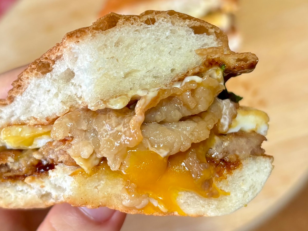 う~~~んウマっ! 旨味たっぷりの牛カルビに絡められた甘辛なすき焼きソースと、半熟風たまごが合わさってまさにすき焼き! めちゃくちゃ美味しいです。牛カルビの脂身も感じられ、まさに年末年始のぜいたくに相応しい仕上がりになっています。驚くべきは、これにさらにビーフパティが合わせられているということ。この圧倒的肉感、ご馳走以外の何物でもないです。