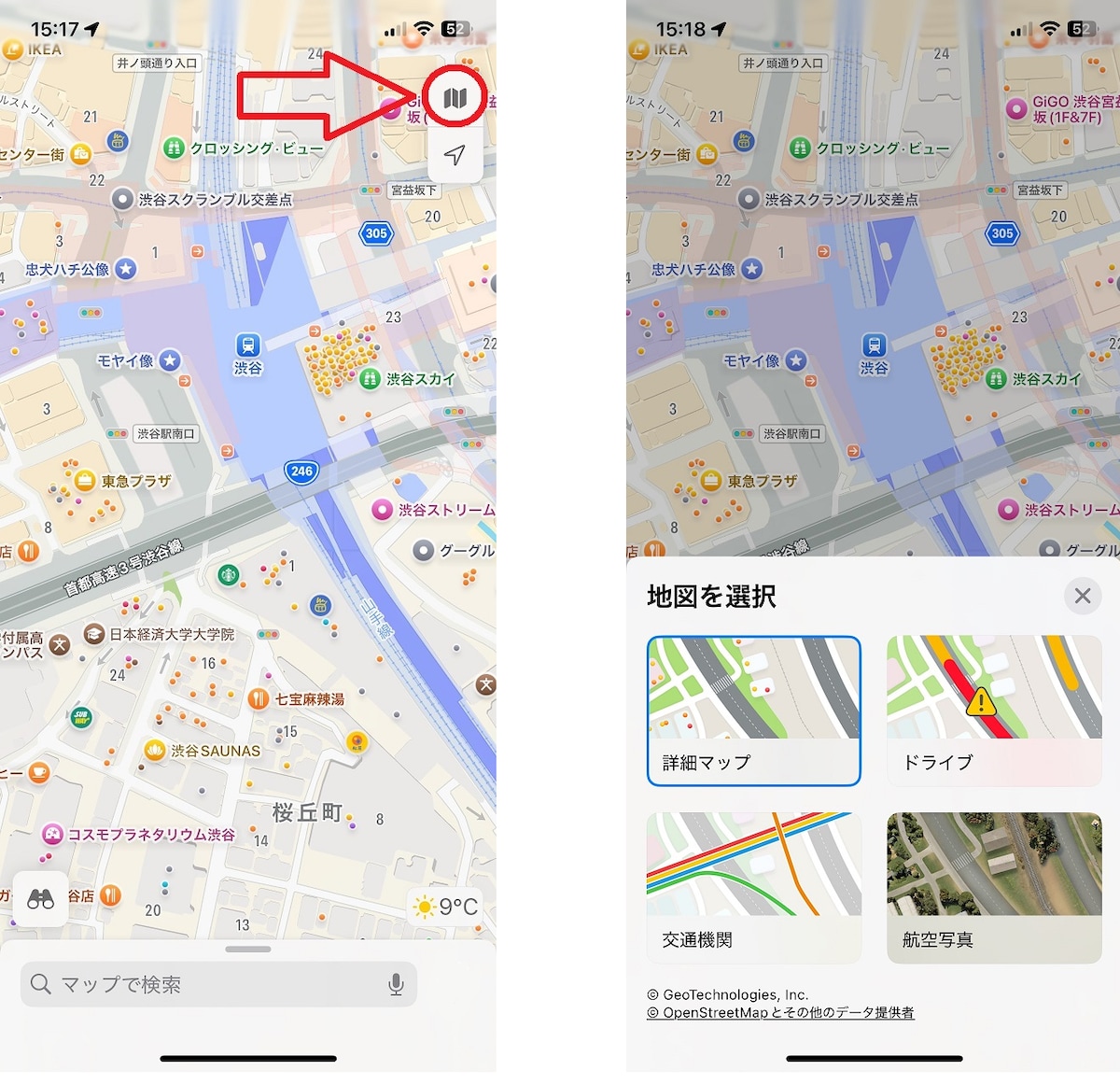 タップすると「詳細マップ」「ドライブ」「交通機関」「航空写真」の4つが表示され、それぞれタップで切り替えが可能です。