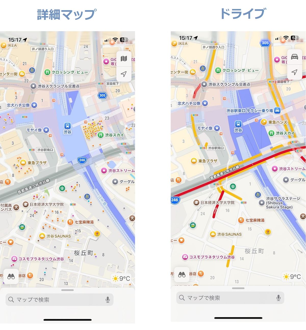 「詳細マップ」(写真:左)は地図上のスポットが細かく示されており、徒歩移動の際やお店などの施設を探す際に便利。「ドライブ」(写真:右)はその名のとおり、交通情報が表示されるため車を運転する際のナビとして最適です。