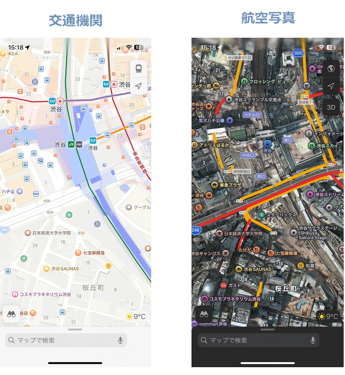 一方電車など公共交通機関で移動をするときには、路線図などが表示される「交通機関」(写真:左)を使いましょう。さらに交通機関では、「タクシー」をタップすることでタクシーの配車が可能。スマホに入っている配車サービスアプリと連携し、現在地までタクシーを呼ぶことができます。また写真で地図が示される「航空写真」(写真:右)は、実際の施設の外観などを確認する際に役立ちます。