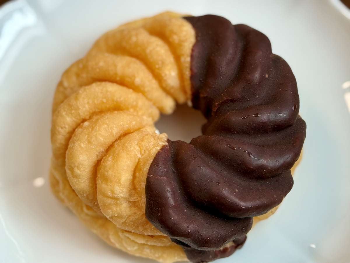 見た目は、ドーナツ店に並んでいてもそん色ない王道のフレンチクルーラー。チョコレートもかかっていて、美味しそう。