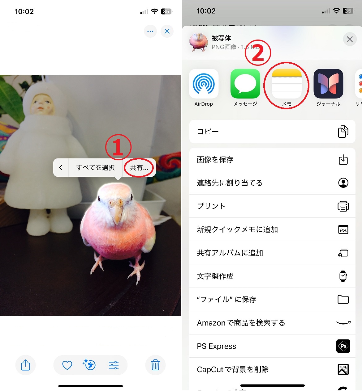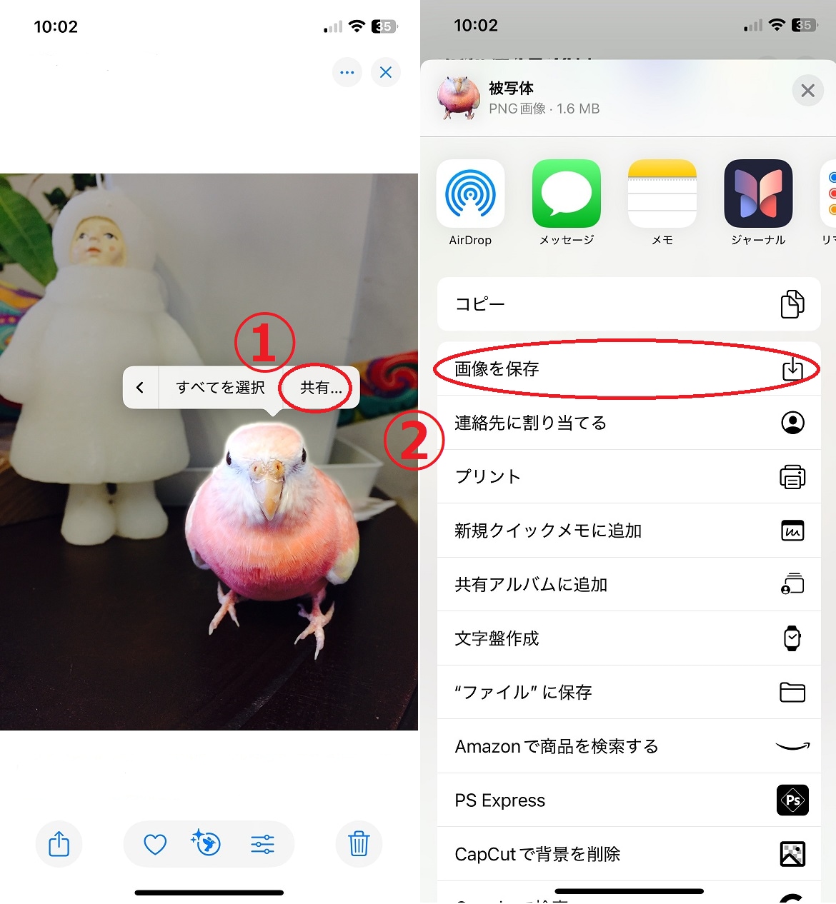 ①切り抜きたい被写体を長押しした際に出てくる「共有」をタップします