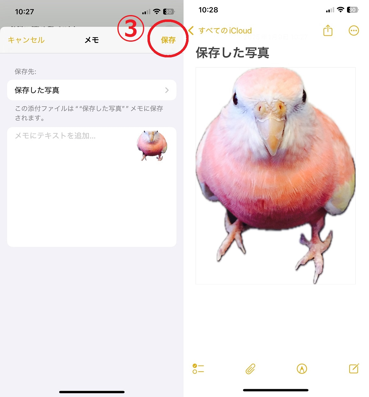 ③必要な方はテキストなどを入力後、右上の保存をタップしてメモへの保存が完了です
