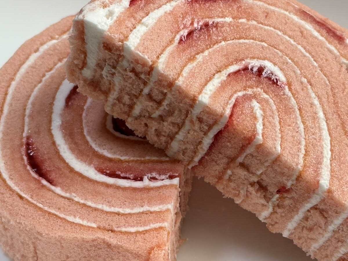 いちごをイメージしたピンクの生地にいちごジャムとミルク風味のクリームをサンドしました。見た目にも華やかで目を引くロールケーキです。