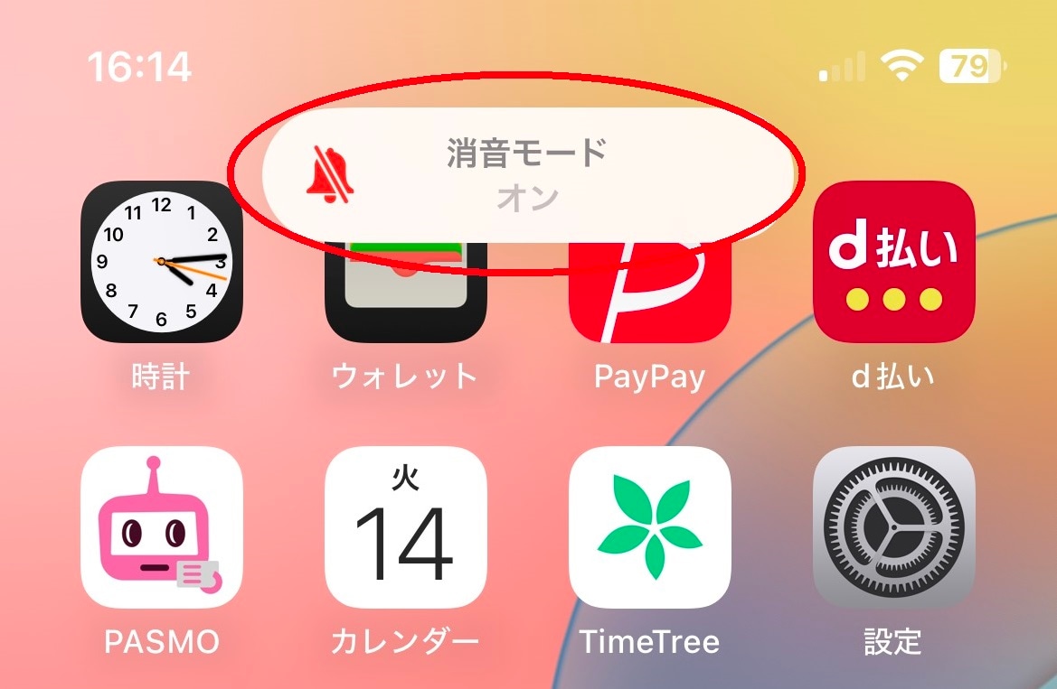 ボタンを下にさげる(オレンジ)と、消音モードをオンにすることができます。