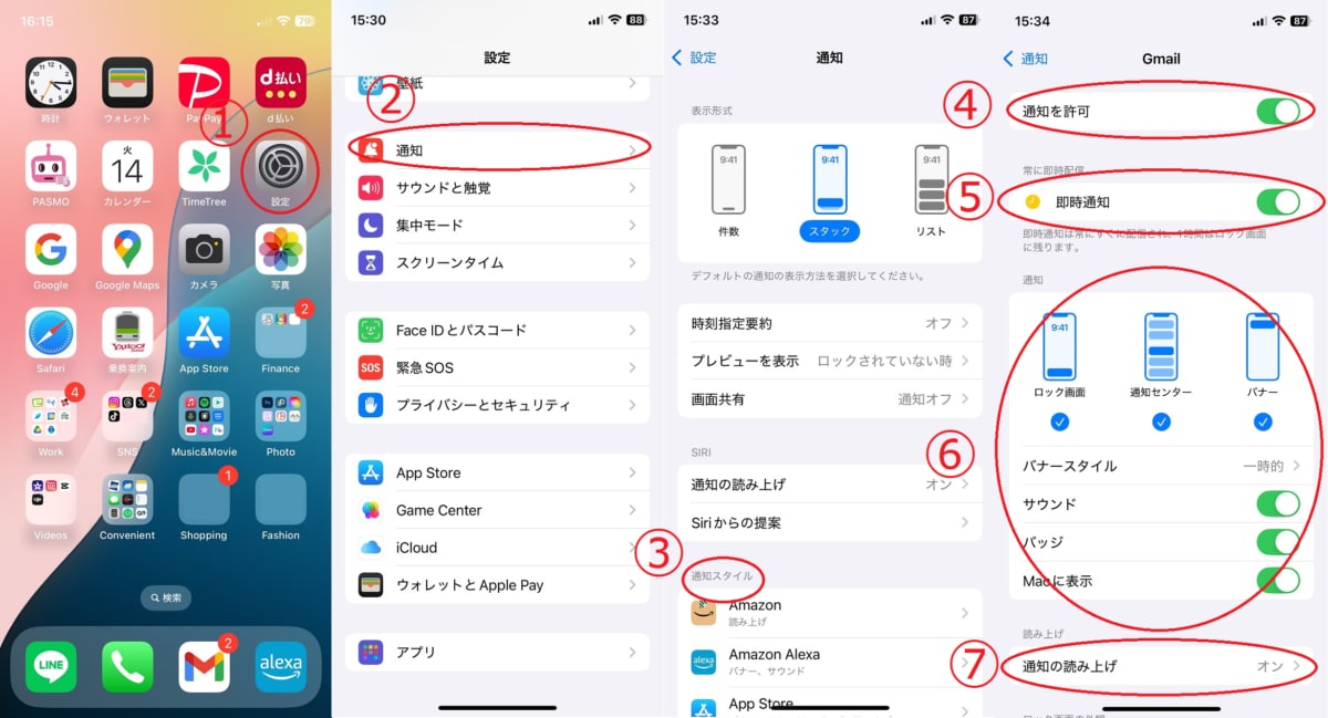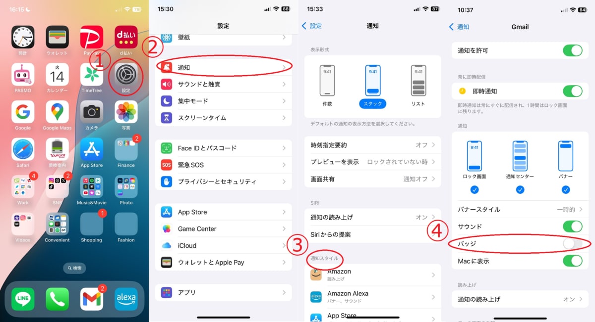 バッジを表示させたいのに表示されない場合には、まず「設定」→「通知」→「通知スタイル」から、「バッジ」が表示されているかどうかの確認をおこないます。