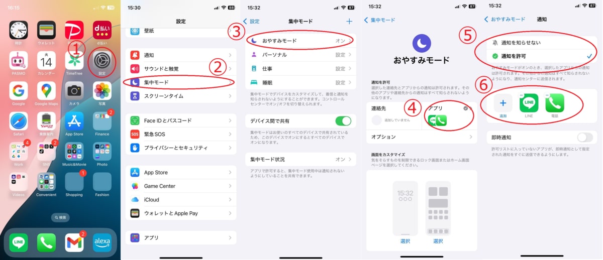 なお、おやすみモードを含む集中モードの設定は以下の手順でカスタムすることが可能です。