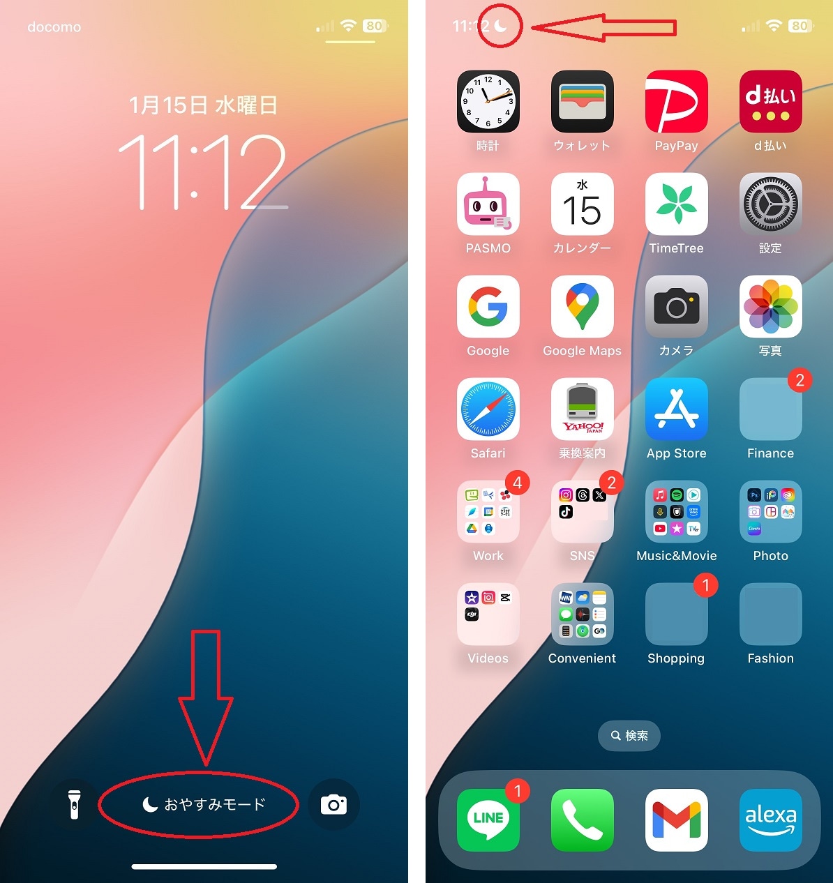 おやすみモードがオンになっていると、ロック画面では下部に「おやすみモード」と表示され、ホーム画面では左上に「月マーク」が表示されます。