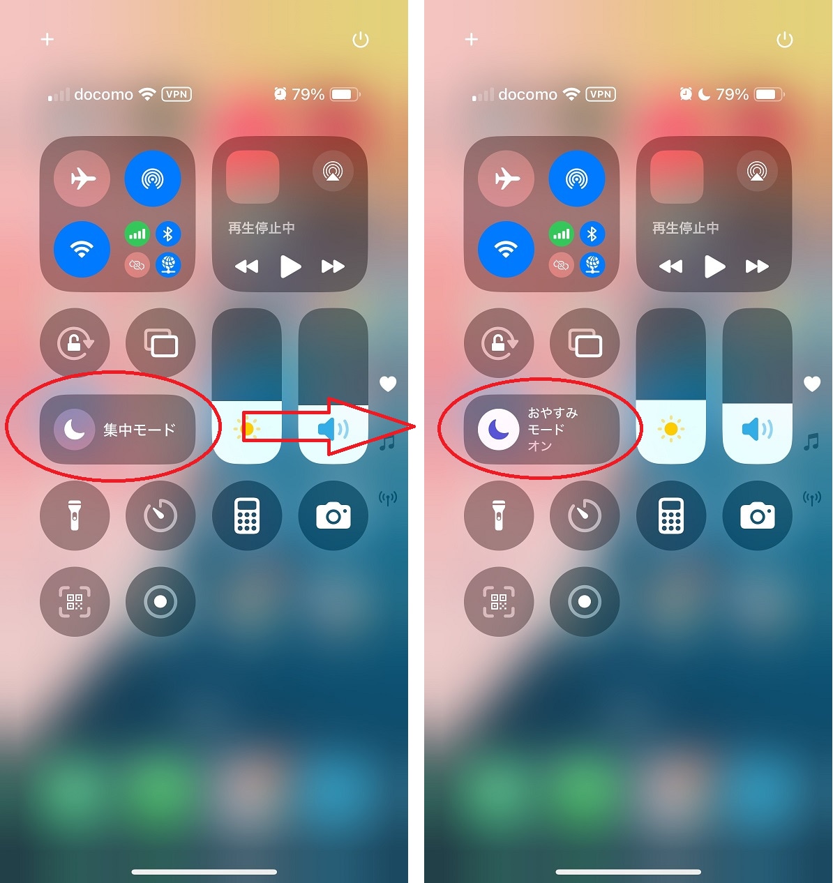 「集中モード」をタップすると「おやすみモード」がオンになります。