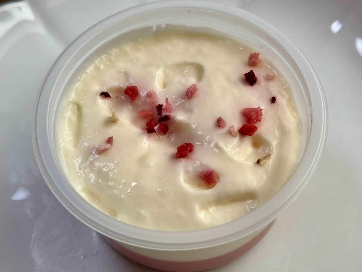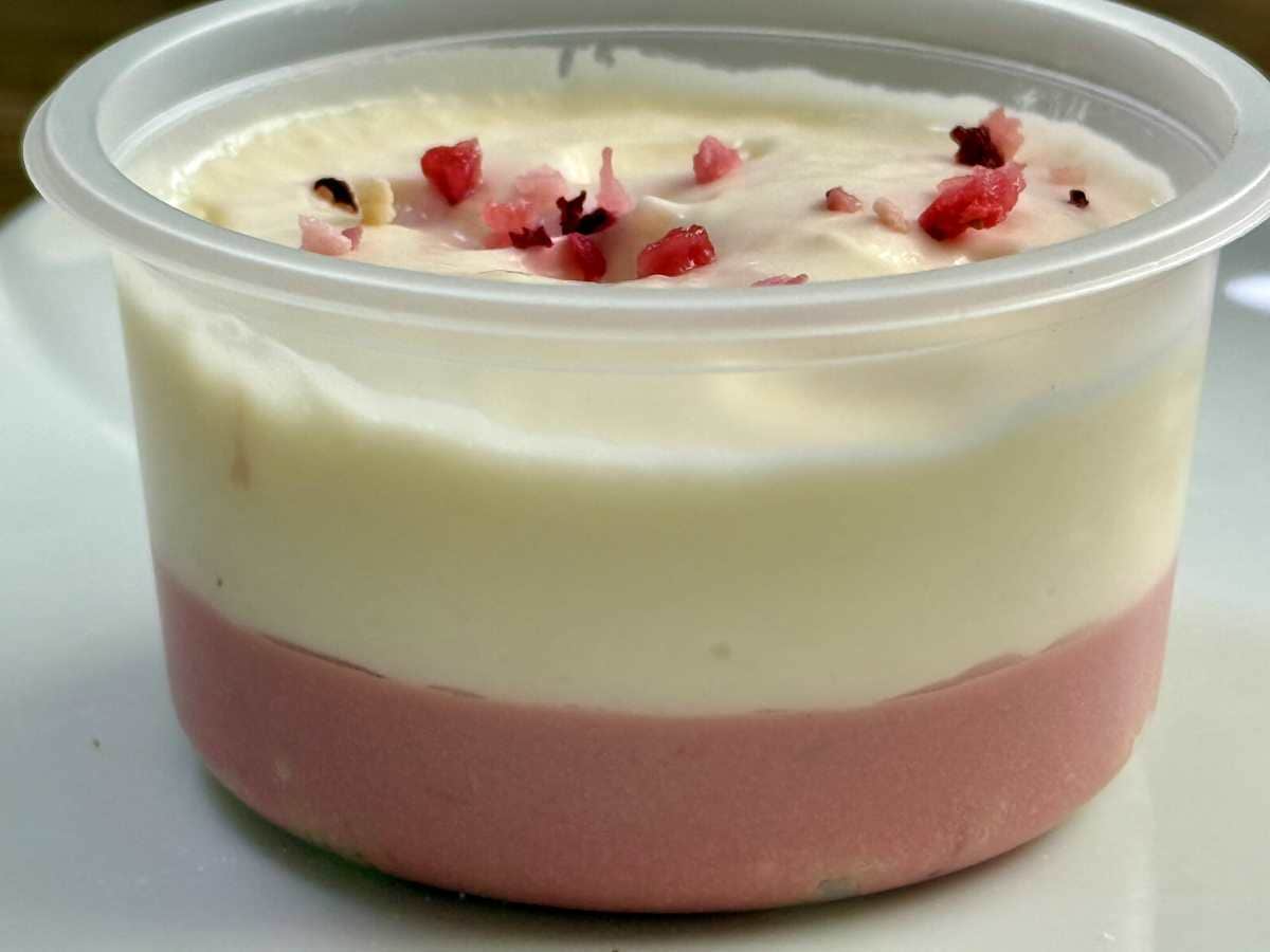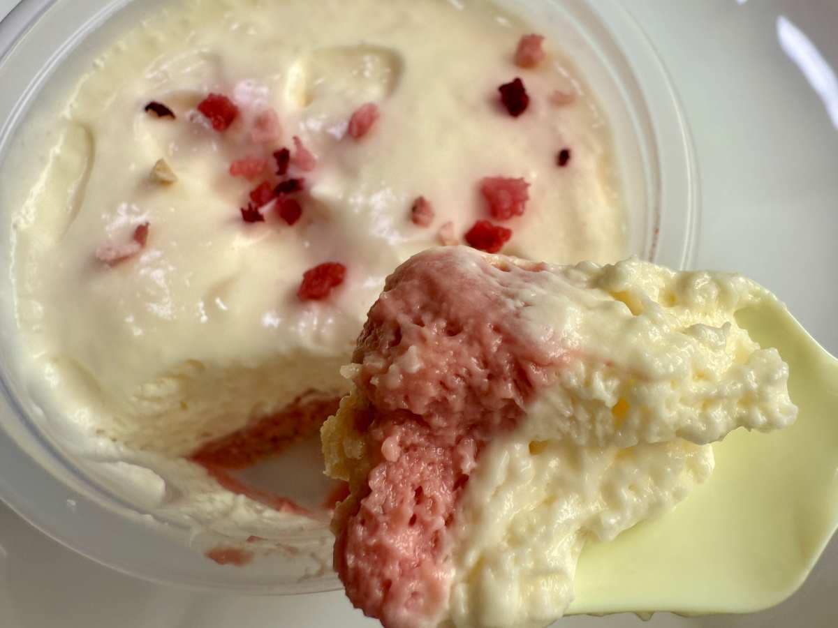 上の白いチーズケーキ層はとても軽やかで、苺のチーズケーキ部分はかなりずっしりめ。しっかりスプーンを差し込まないと進まないほど。