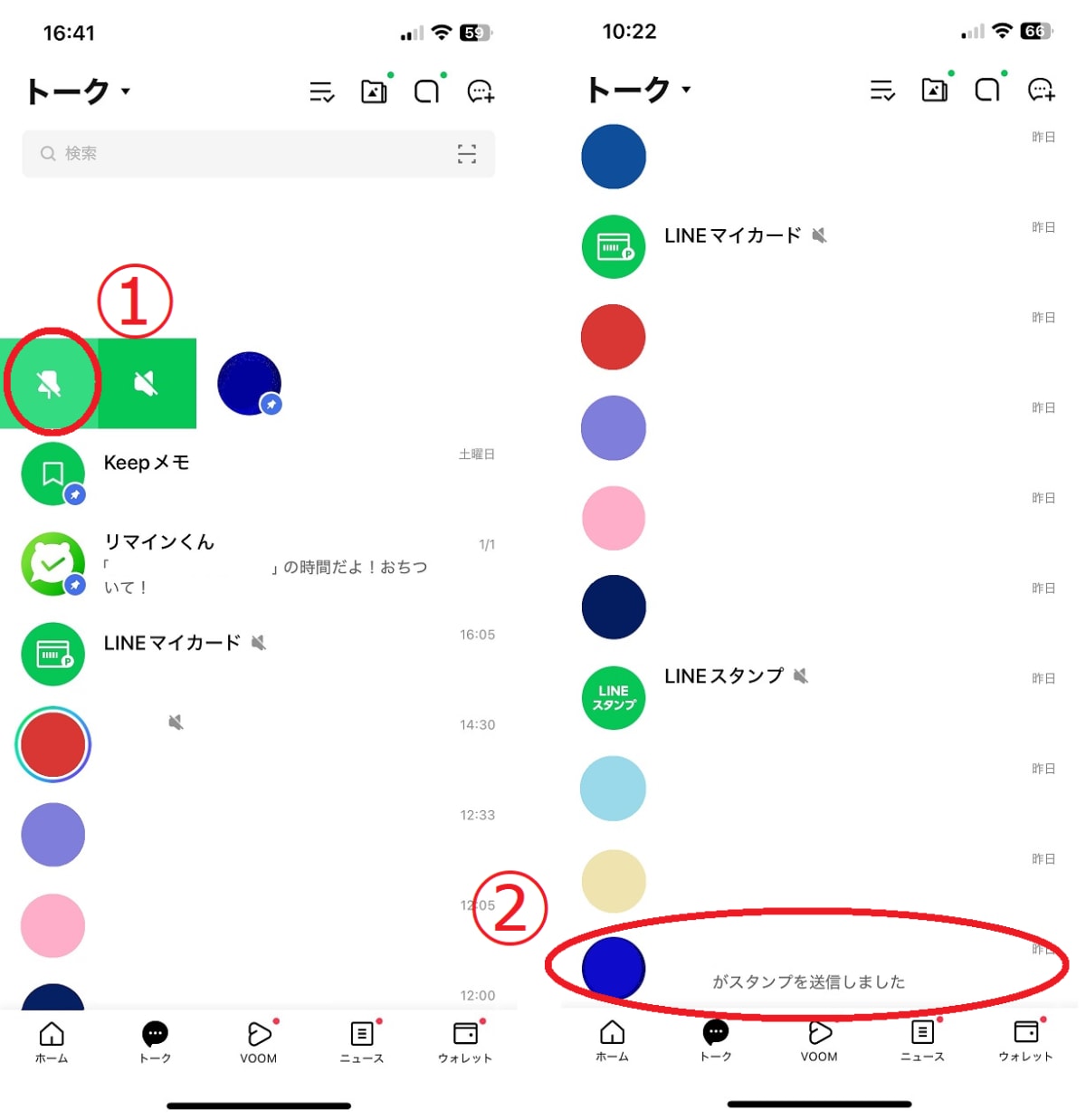①ピン留めを解除したいトークルームを選び、右にスワイプ。ピン留め解除のマークをタップします